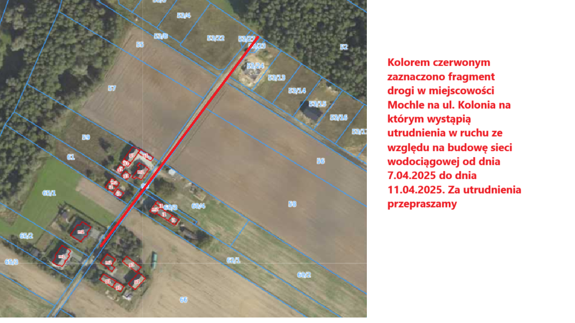 W najbliższym tygodniu na drodze do Szczutek ul. Kolonijna prowadzone będą prace związane z budową odcinka wodociągu. Z uwagi na prowadzone prace wzdłuż drogi będzie występowała czasowa nieprzejezdność w tracie robót tj. od 8.00 do 16.00 zgodnie z załączoną mapką z zaznaczonym obszarem na którym przewidziane są roboty w najbliższym tygodniu.